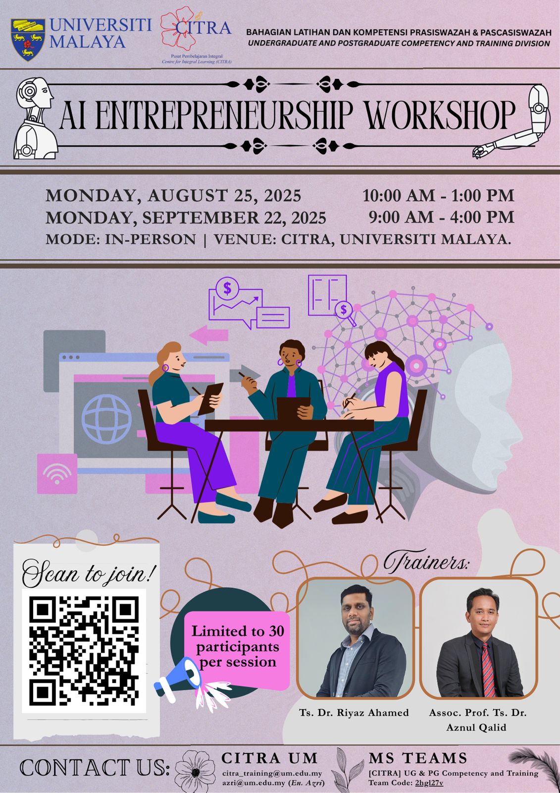 We are pleased to invite you to participate in an upcoming AI Entrepreneurship Workshop. It is designed for UM staff who aim to enhance their entrepreneurship courses by embedding artificial intelligence (AI) concepts and perspectives. Participants will gain practical insights from experienced trainers, Ts. Dr. Riyaz Ahamed and Assoc. Prof. Ts. Dr. Aznul Qalid.