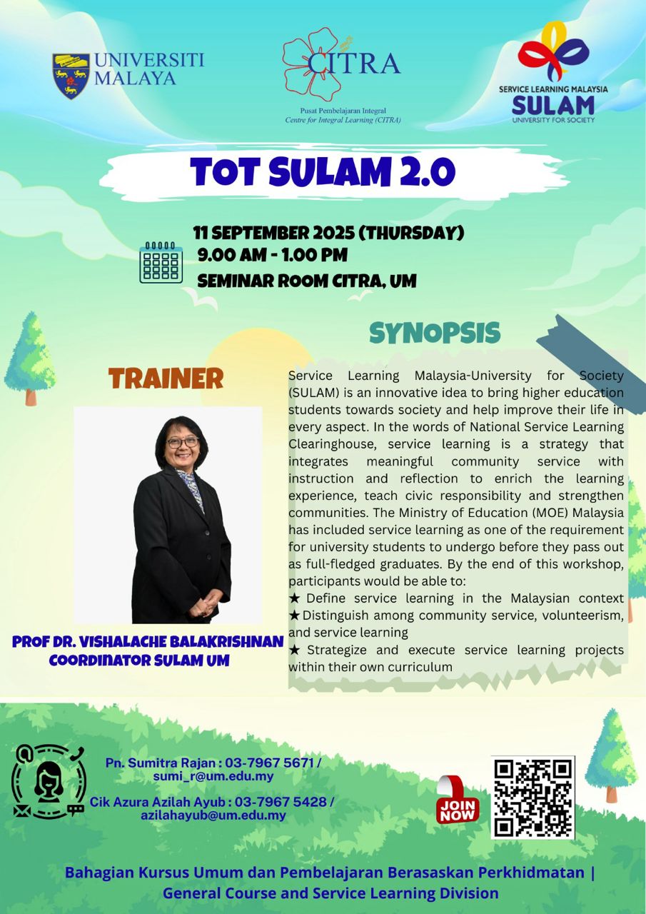 3. Untuk makluman, bengkel Training of Trainers (ToT) SULAM 2.0 adalah merupakan insiatif strategik untuk memperkukuhkan kefahaman penyelaras, pensyarah dan pentadbir SULAM bagi meningkatkan kemahiran dalam merancang, melaksanakan, dan menilai projek SULAM di PTj masing-masing. Maklumat bengkel adalah seperti di bawah: