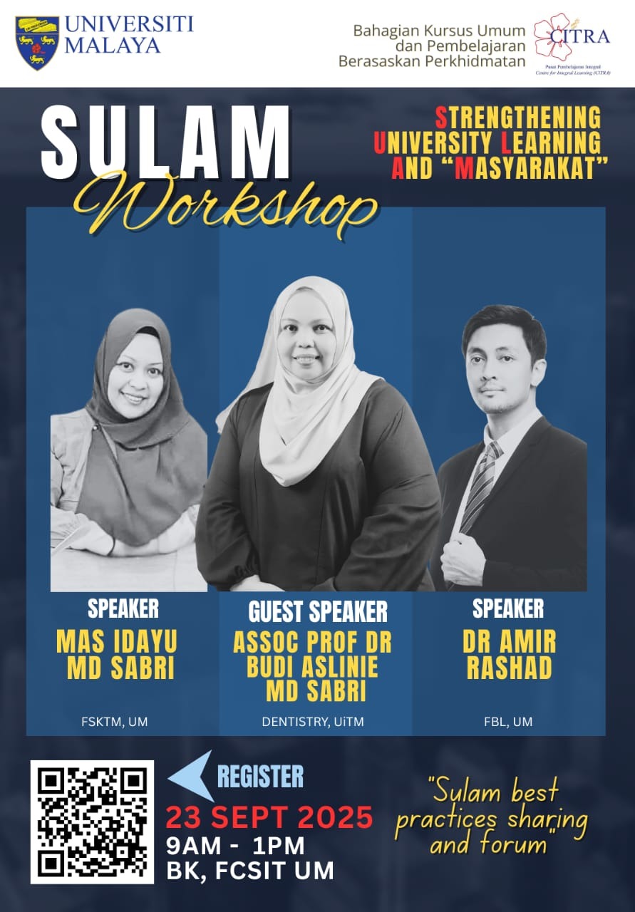 3. Untuk makluman, bengkel SULAM – Strengthening University Learning And "Masyarakat" adalah merupakan insiatif strategik untuk memberi kefahaman asas mengenai pelaksanaan SULAM dalam pengajaran dan pembelajaran, berkongsi pengalaman daripada projek pembelajaran berasaskan komuniti yang berjaya, serta memberi panduan praktikal kepada pensyarah untuk mereka bentuk projek SULAM dalam kursus mereka. Maklumat bengkel adalah seperti di bawah: