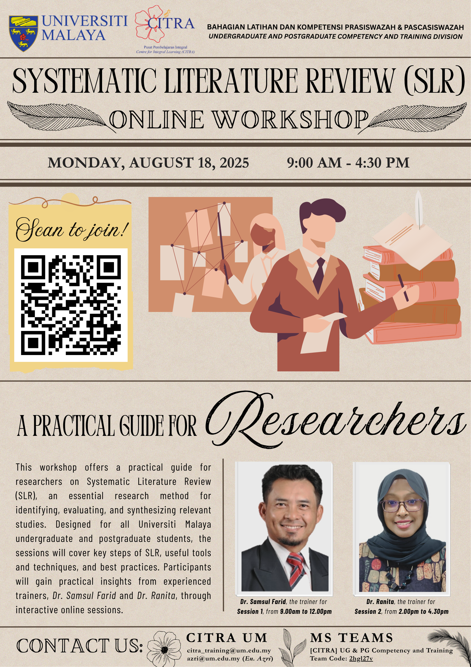 Systematic Literature Review (SLR), an essential research method for identifying, evaluating, and synthesizing relevant studies. Designed for all Universiti Malaya undergraduate and postgraduate students, the sessions will cover key steps of SLR, useful tools and techniques, and best practices.Participants will gain practical insights from experienced trainers,