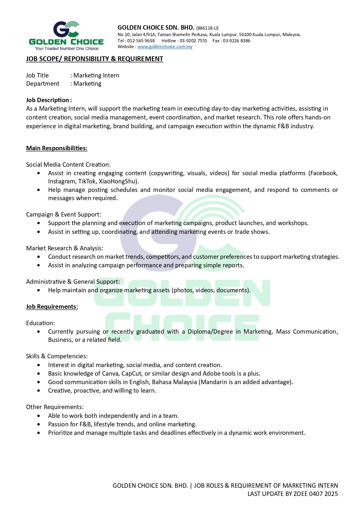 | Golden Choice Sdn Bhd | Marketing | 13 August 2025 | 2025 | |