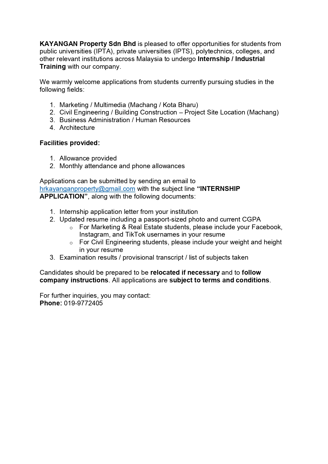 | KAYANGAN Property Sdn Bhd | Marketing,Business,Engineering,Human Resources (HR) | 17 October 2025 | 2025 | |