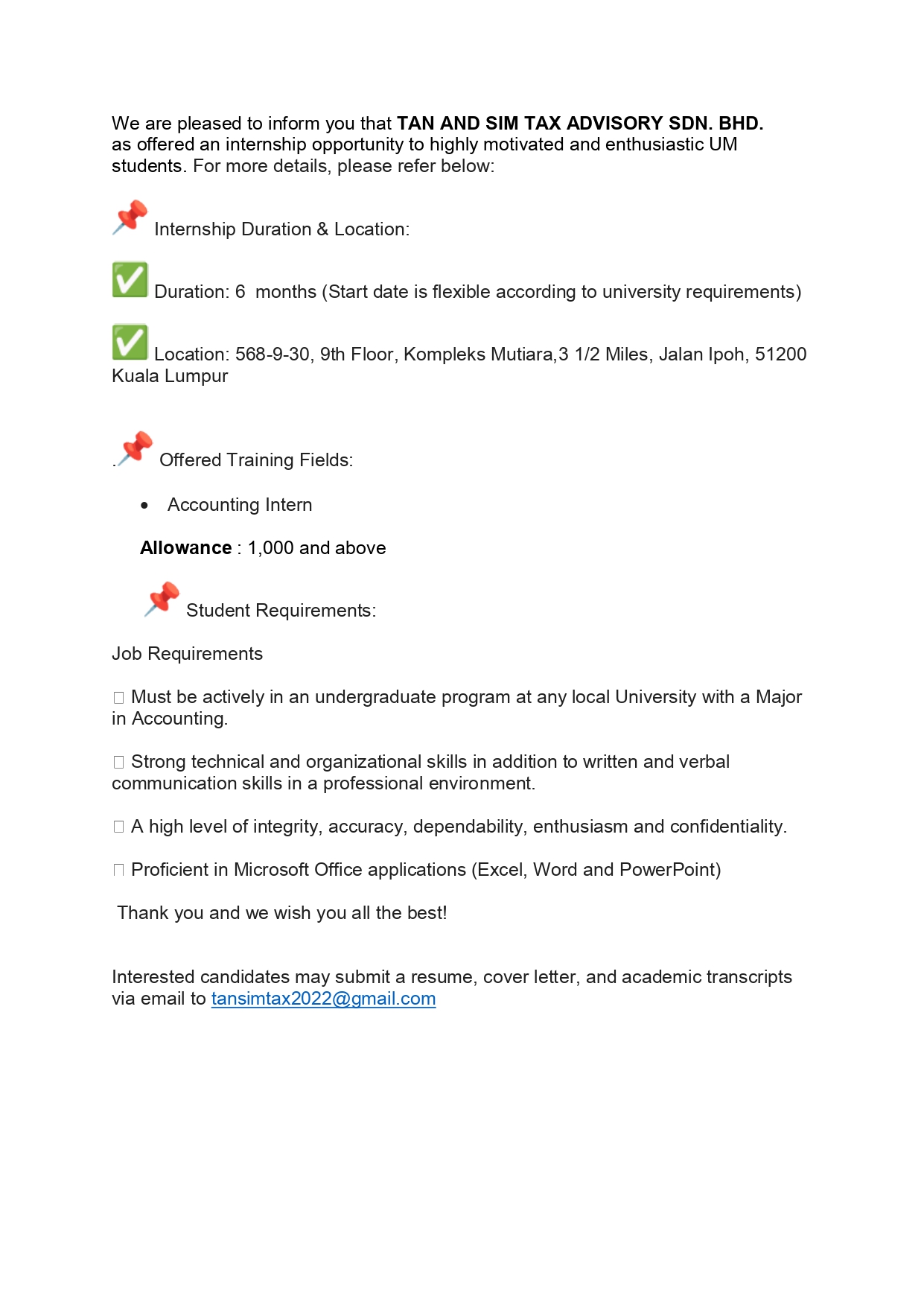 | NTAXPRO SDN BHD | Marketing, Business Administration, Business Management | 8 August 2025 | 2025 | |