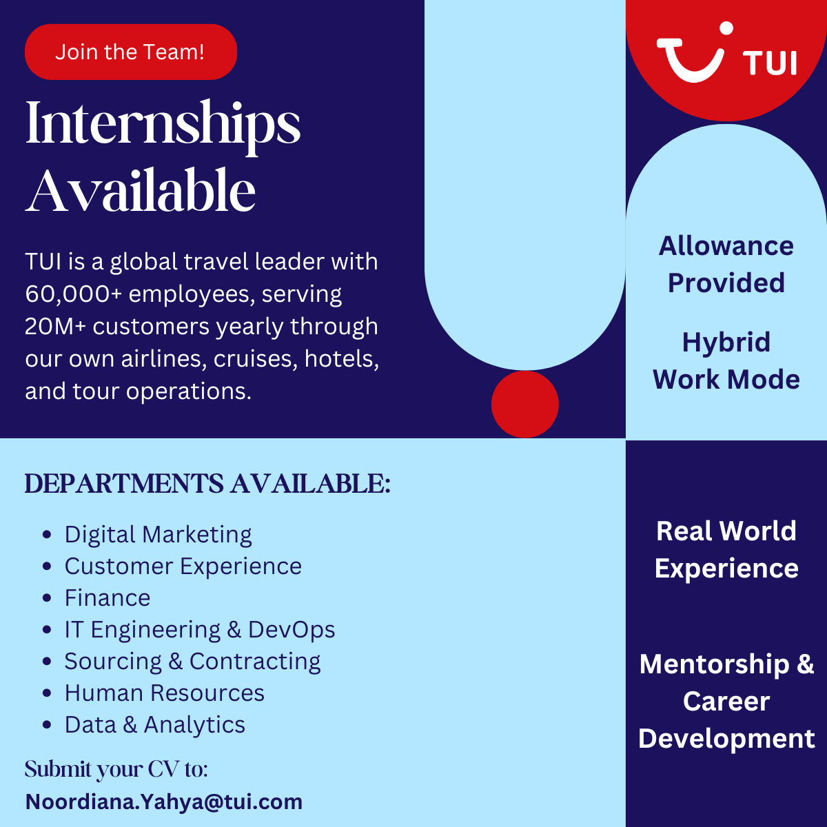 | TUI Malaysia | Finance, Human Resources (HR), Information Technology (IT), Marketing | 6 August 2025 | 2025 | |